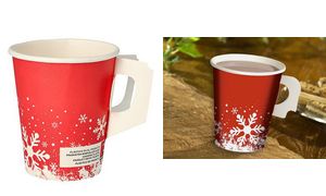 Kartonnen bekers met wintermotief en handvat, 80mm diameter, 93mm hoog. Geschikt voor warme dranken tot 90°C. Set van 50 stuks. Productomschrijving in het engels, Productdescription in English Cardboard cups with winter design and handle, suitable for hot beverages up to 90°C, pack of 50.