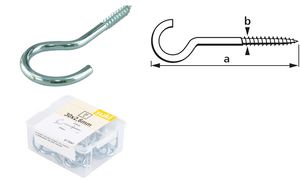 Verzinkte stalen schroefhaken met houtdraad, gebogen uitvoering. Geleverd in praktische kunststof doos met 30 stuks voor diverse bevestigingsdoeleinden. Productomschrijving in het engels, Productdescription in English Galvanized steel screw hooks with wood thread, curved design, 30 pieces in plastic box.