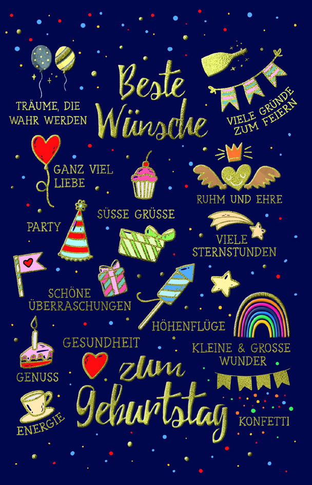 Birthday card measuring 110 x 170 mm. Features foil finishing with foil embossing for an elegant look. Includes white envelope. RRP on packaging: €2.99.