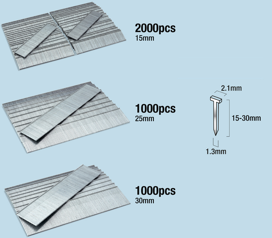 Spijkers type 180 in drie lengtes: 2.000x15mm, 1.000x25mm, 1.000x30mm. Geschikt voor perslucht spijkerpistool DGN50V. Totaal 4.000 stuks voor veelzijdig gebruik. Productomschrijving in het engels, Productdescription in English Multi-size nail pack with 4,000 pieces in 15mm, 25mm and 30mm lengths for pneumatic nailers.