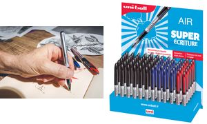 **uni-ball AIR rollerpen display met 72 stuks. Variabele lijndikte door drukgevoelige punt. Bevat 36 zwarte, 24 blauwe en 12 rode pennen met clip in bijpassende kleur.**