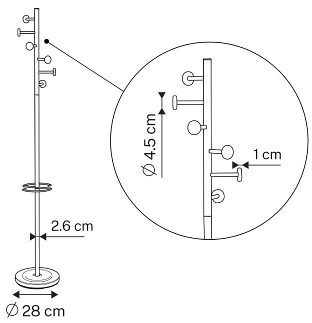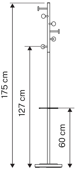 Kapstok met totale hoogte van 1.750 mm en sokkeldiameter van 280 mm. 6 haken in spiraalvorm gerangschikt, draagkracht 5 kg per haak. Mast van metaal en hout met beukenhouten afwerking, haken van metaal en ABS-kunststof. Productomschrijving in het engels, Productdescription in English Coat stand with 1,750 mm height and 280 mm base diameter. 6 spiral-arranged hooks, 5 kg capacity each. Metal and beech wood post, metal and ABS hooks.