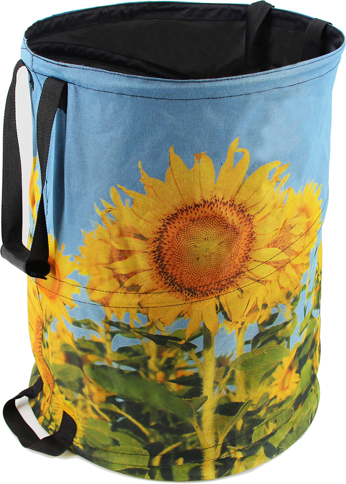 Opvouwbare bloemenregenton van hoogwaardig kunststof. Praktisch en stijlvol met vrolijk zonnebloemmotief. Afmetingen: 47 cm doorsnede, 63 cm hoog. Voorzien van twee handgrepen en twee bodemgrepen. Waterdicht en geschikt voor binnen- en buitenshuis. Compact op te bergen wanneer niet in gebruik. Artikelnummer: 998007.