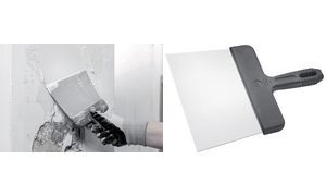Vierkante plamuurspatel van roestvrij edelstaal met flexibel blad en kunststof handgreep voor professioneel afwerkingswerk. Productomschrijving in het engels, Productdescription in English Square putty knife with stainless steel flexible blade and plastic handle for professional finishing work.
