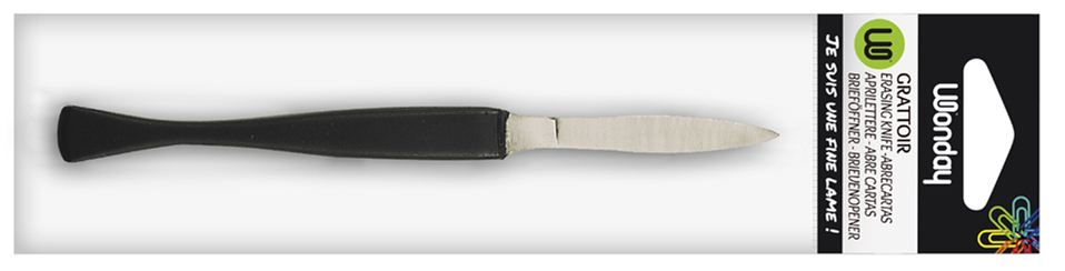 Zwart gummes met ergonomisch gevormde kunststof handgreep en 150 mm stalen lemmet. Geleverd op blisterverpakking voor eenvoudig gebruik. Productomschrijving in het engels, Productdescription in English Black eraser knife with ergonomic plastic handle and 150mm steel blade on blister card.