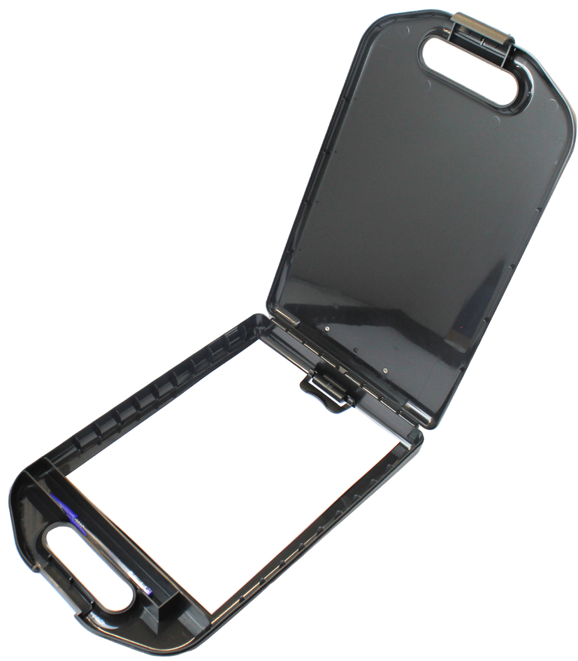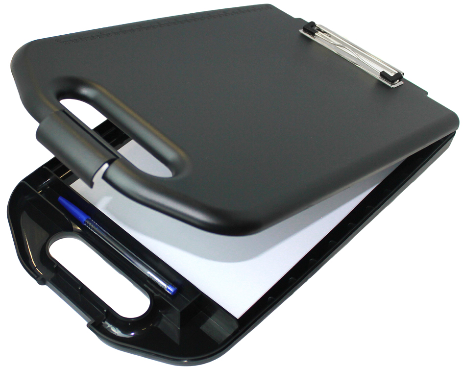 Functional A4 clipboard with storage compartment, durable clip and handle. Features quality plastic construction with secure clip closure.